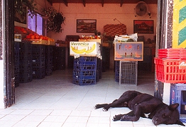 Outside, baskets and shelves are filled with chiles, squash, tomatoes. A dog is