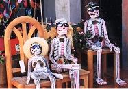 in a Mexican clothing store, a tourist shop, with life-sized Día de los