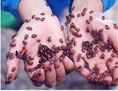 ferns so covered in lady bugs that you can't see the green for their red. In